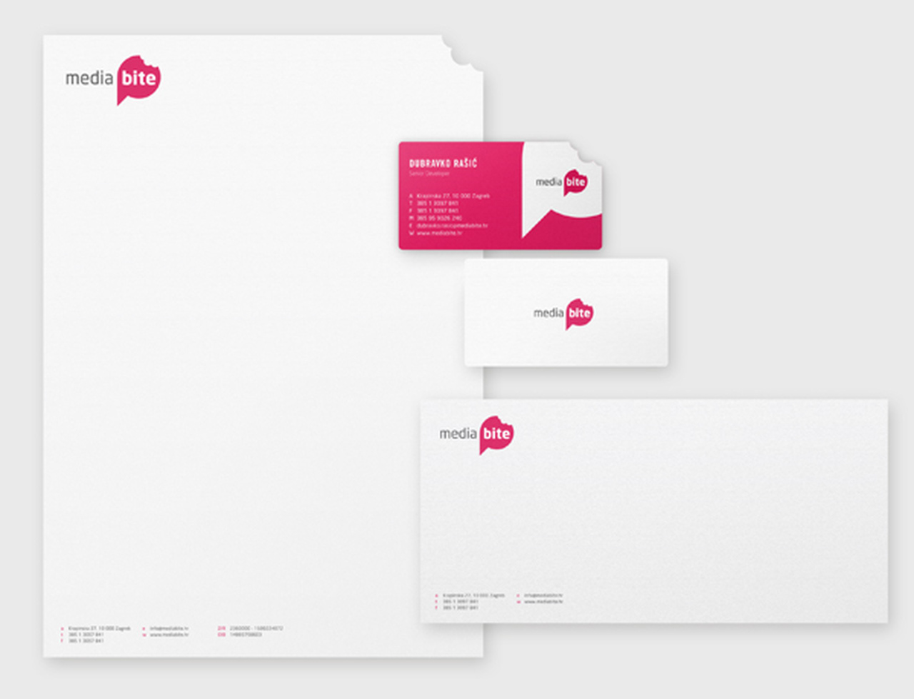 Sosyal medya reklamcılığı alanında hizmet veren Media Bite adlı kuruluş için yapılan örnek çalışmalar, kurum ismi ile bütünleşecek tarzda ve oldukça akılda kalıcı biçimde tasarlanmış. Üstelik kurumsal kimlik araçlarının köşelerindeki ısırık görünümü, ısırmak anlamına gelen “ bite” kelimesini çağrıştırmak açısından oldukça başarılı.